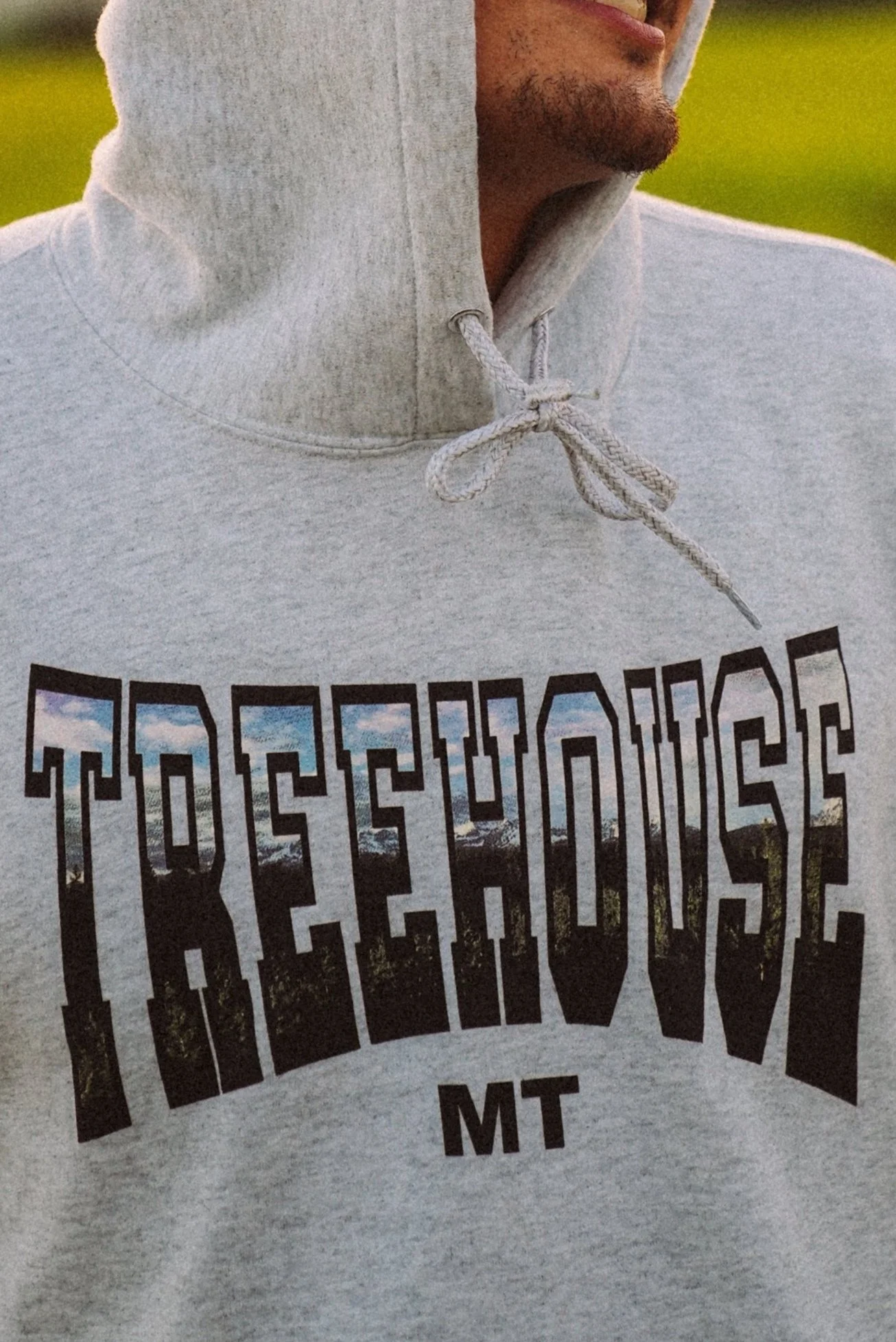 TreelineCOLLECTION featuring a screen printed image of the Montana-Canadian border Shop Treeline Crewneck $40.00 Treeline Hoodie $55.00 Treecycle Coming Soon